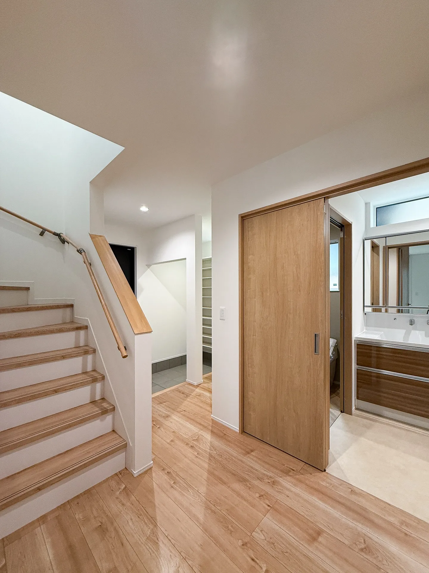 家事も身支度も、ムダなく一直線◎ 家事も身支度も、ムダなく一直線◎玄関から→トイレ→洗面→ランドリー→お風呂水廻りがスムーズにつながる真ん中には家族みんなで使えるファミクロ脱ぐ・洗う・しまうがすぐそばで完結✨動線がコンパクトだか…
